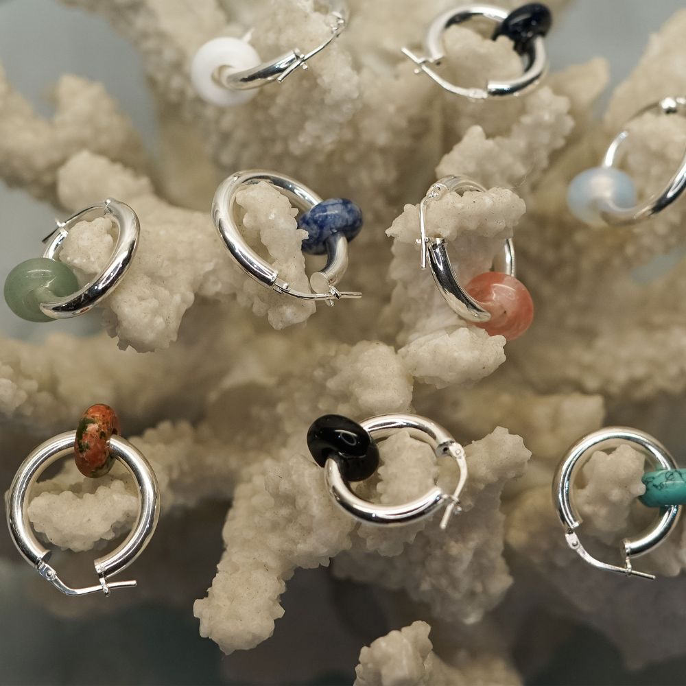 Sterling Silver Chunky Hoop with Natural Unikate Stone. Typically mix of green epidote, pink feldspar and white to grey quartz. Click HERE to upgrade to gold plating for added richness and wear resistance—ideal for those who love lasting brilliance.